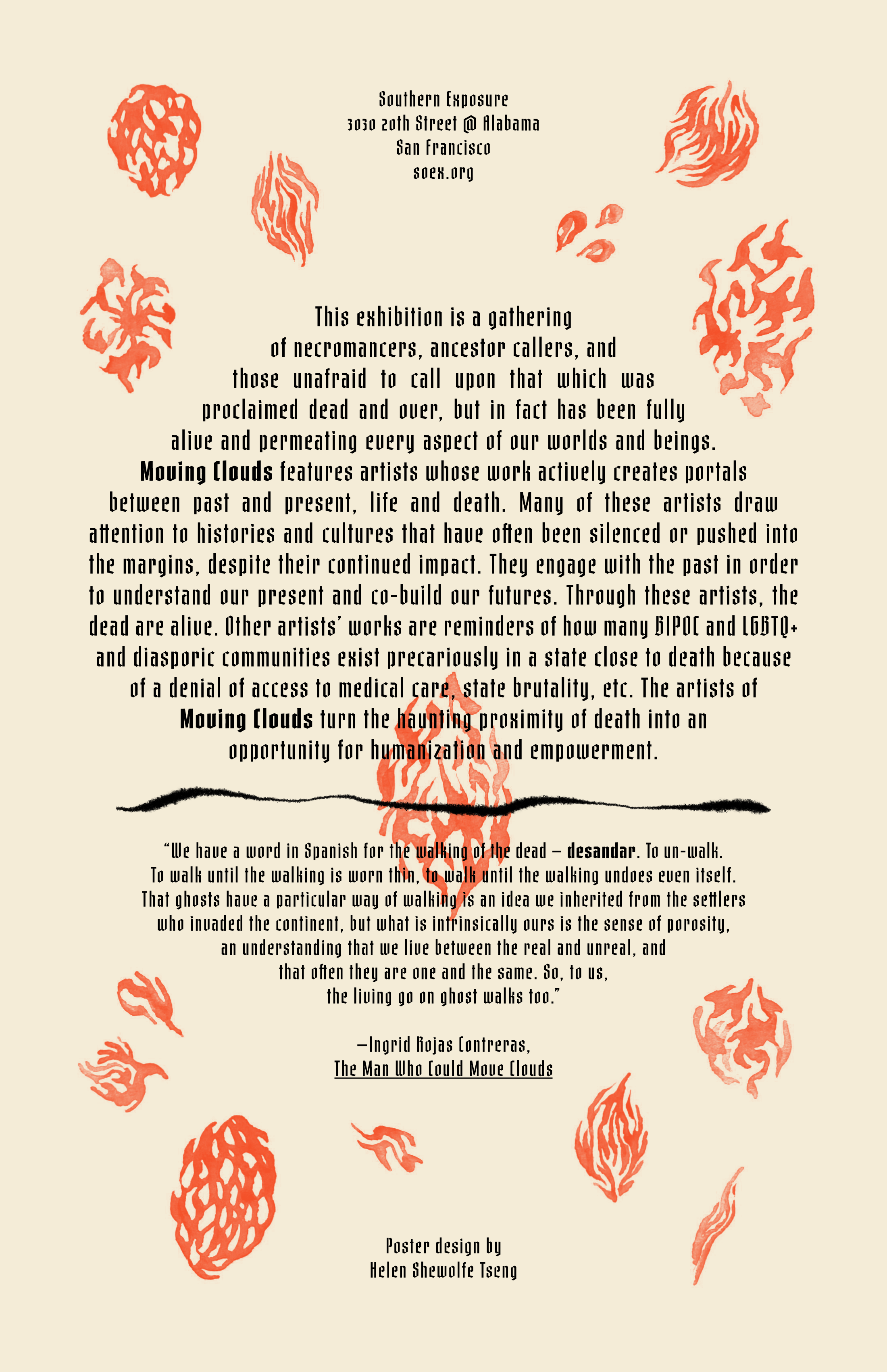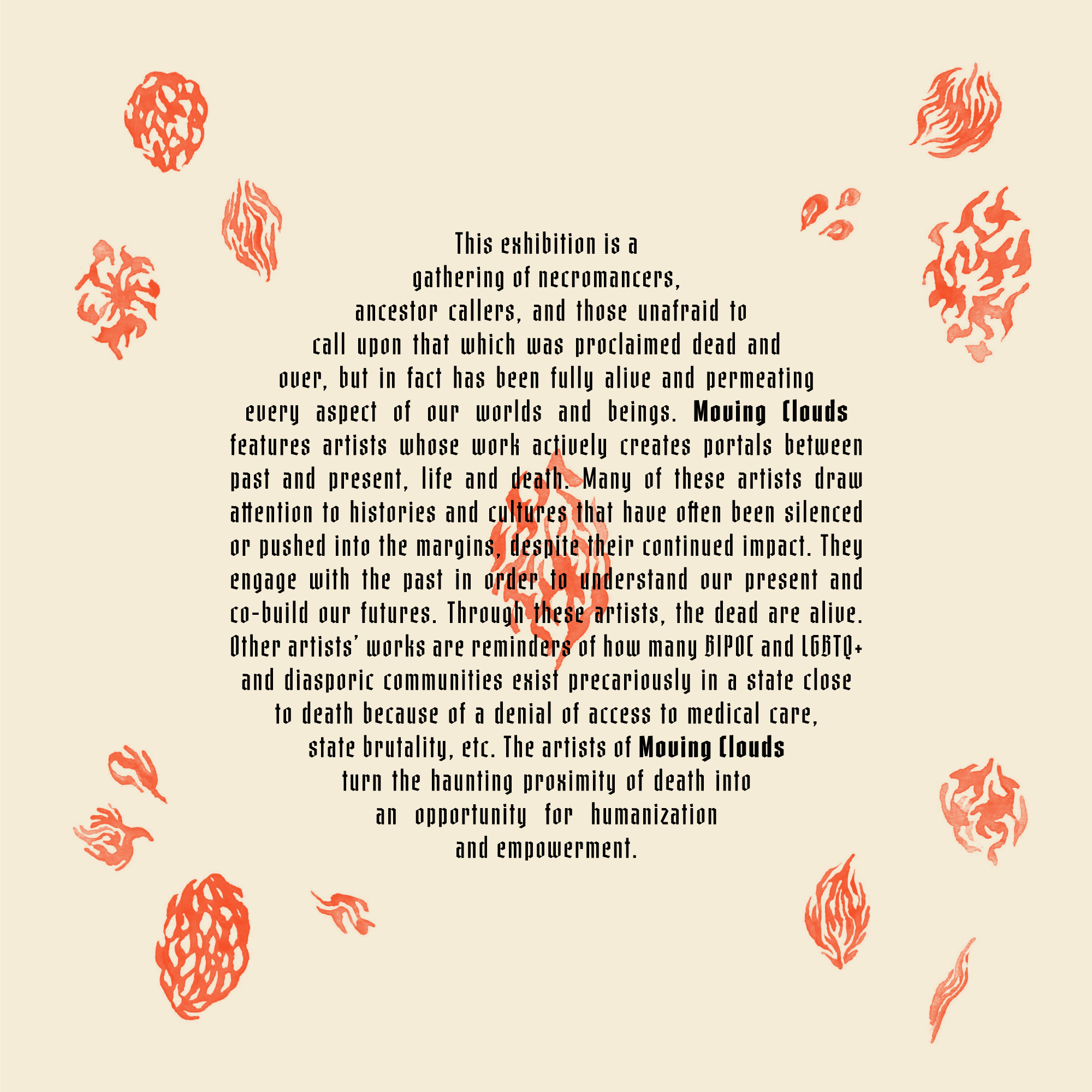 To reflect the show’s themes of necromancing, ancestral calling, and opening portals between the living and spirit worlds, the exhibition identity and related visuals were inspired by smoke, fruit seeds, mold, and joss paper, rendered in watercolor and ink in collaboration with my growth spells mark-making practice. The exhibition title, Moving Clouds, is inspired by Ingrid Rojas Contreras’ gorgeous memoir, The Man Who Could Move Clouds.
